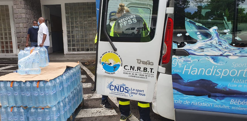 Ce matin, des packs d'eau offerts par la Société CAPES Dolé de Gourbeyre ont été livrés, par le Cercle des Nageurs de la Région de Basse-Terre, association agrée Sécurité Civile de la Fédération Française de Sauvetage et de Secourisme, au local du groupe Radical Mas, à Pointe-à-Pitre, ainsi qu'à l'IUT de St Claude pour 80 étudiants qui pourront ainsi bénéficier d'un temps de répit salutaire.